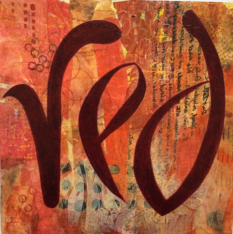 Mixed media with acrylics, and collage on birch wood panel, 12” x 12” x 1 5/8” (30 cm x 30 cm) in natural maple wood frame.
