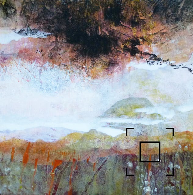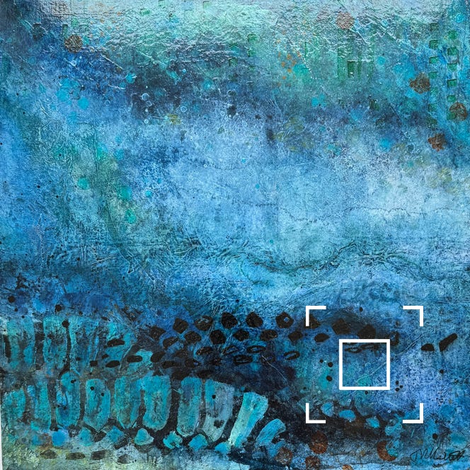 Acrylic paint, collage, mixed media on birch wood panel, in black floater frame 12” x 12”