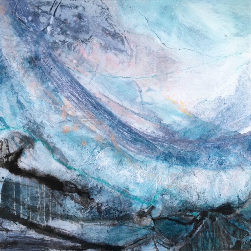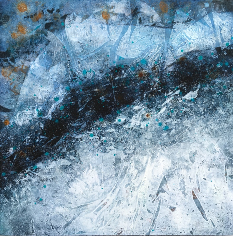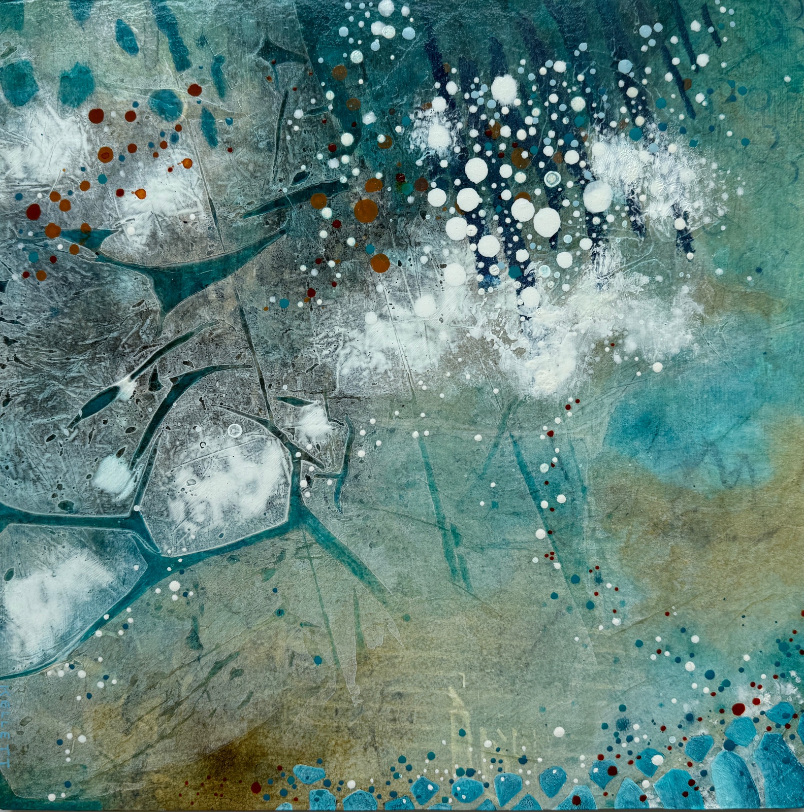 Acrylic, collage mixed media, oils on cradled pane.l. 12” x 12” (30cm x 30cm) in 2” deep maple floater frame..