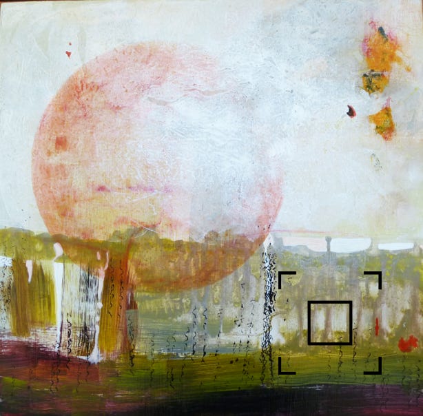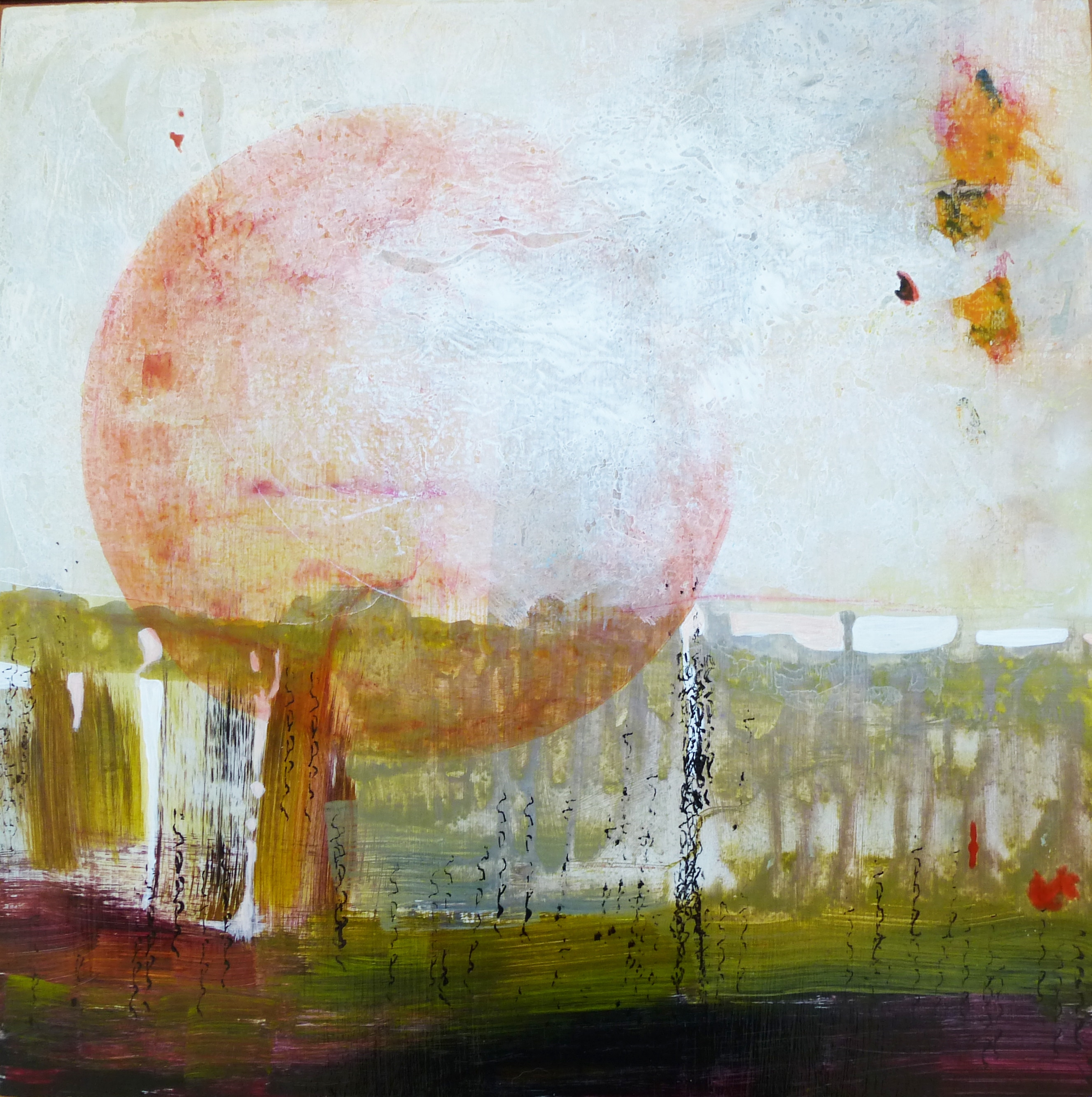 Acrylic paint, collage, mixed media on birch wood panel in white floater frame.