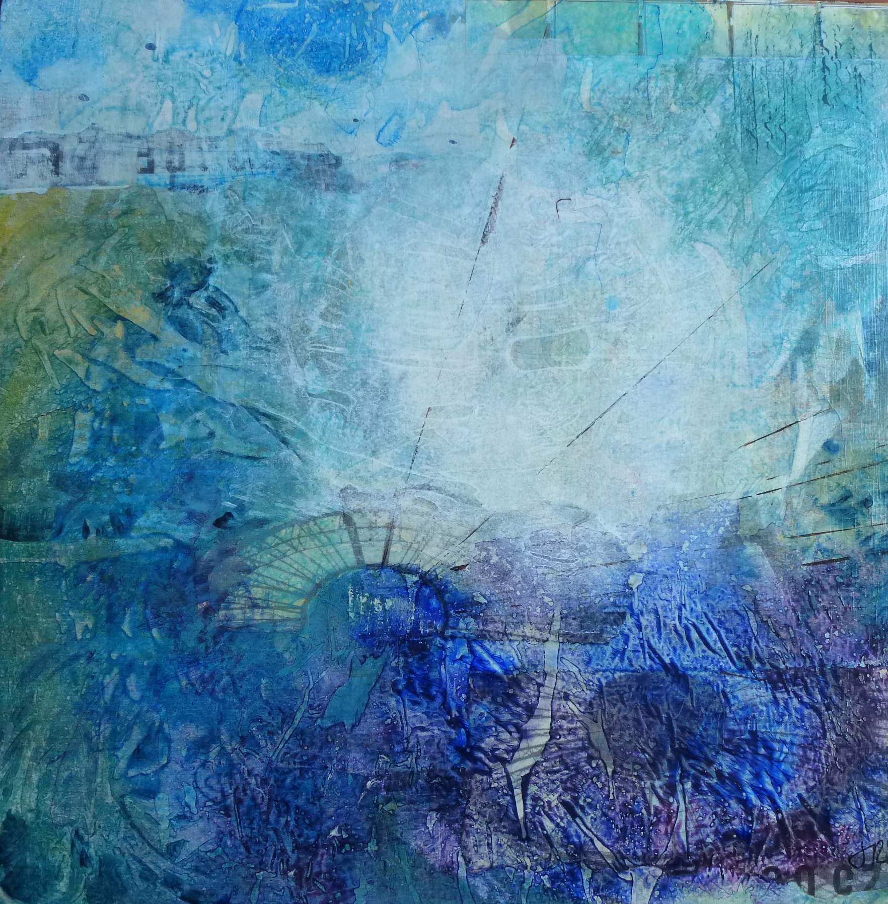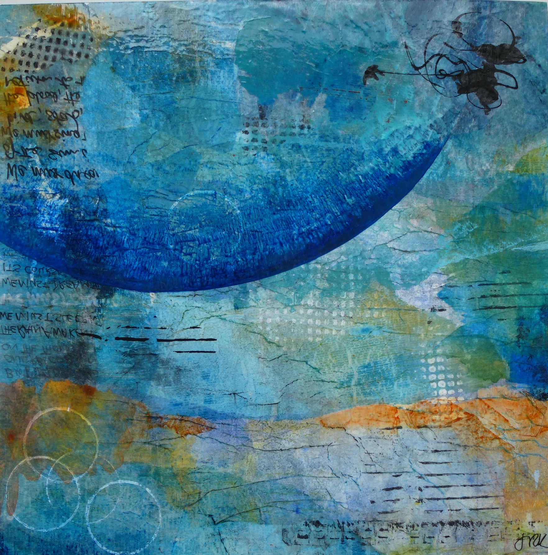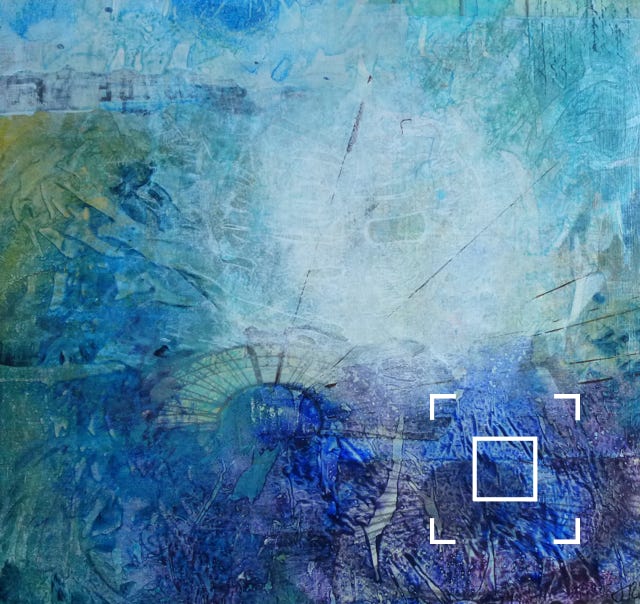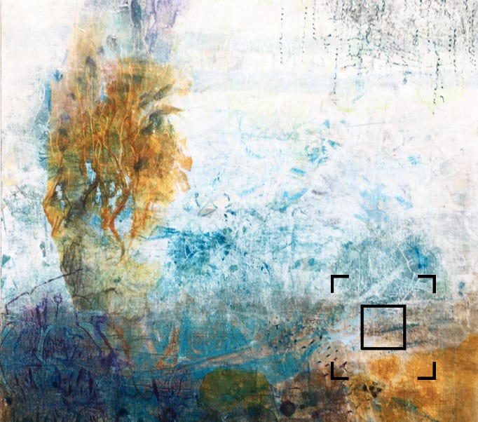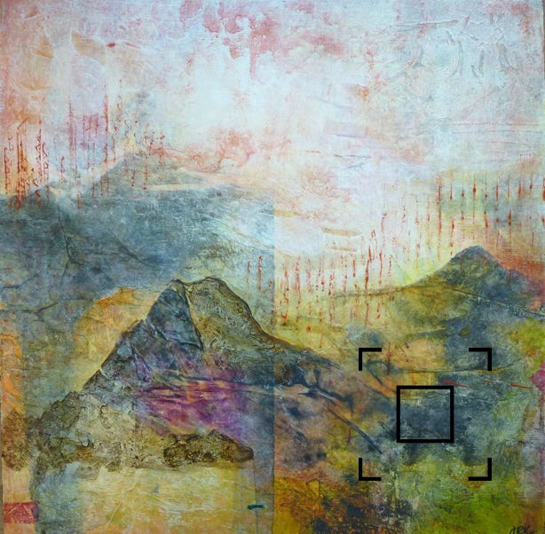Acrylic paint with collage on birch wood panel, in dark wood floater frame. 12” x 12” (30cm x 30cm.)