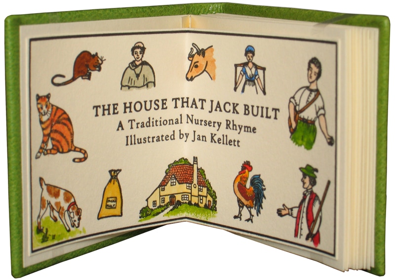 The design of the book allows a double page for each object or character, using diminishing text sizes to accommodate the verse as it grows longer. Constructing the book with guards, so that each double page stands away from the spine when open, allows the pictures to be easily seen, yet maintains a neat book shape when closed.