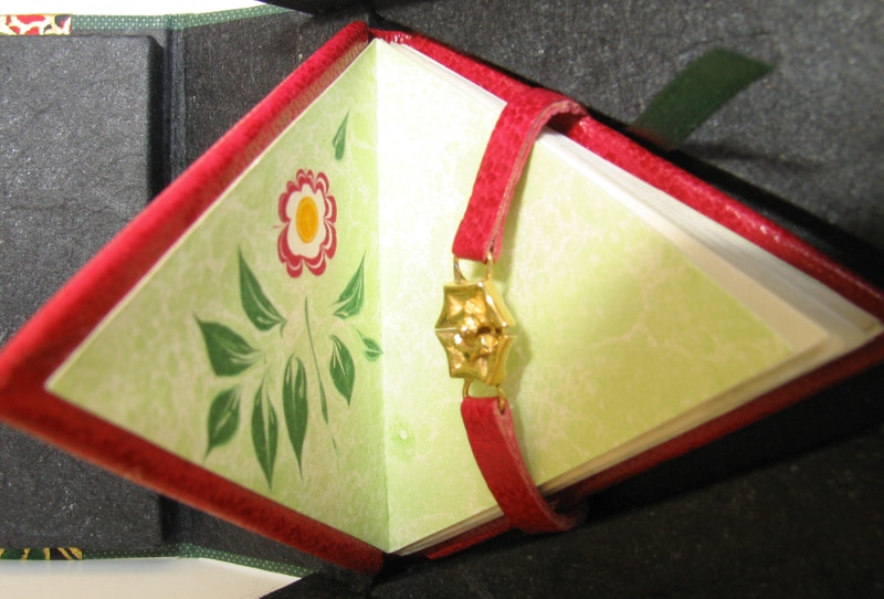 The hexagon folds into a triangular book, which is bound in red goatskin leather. The covers are fastened with tiny straps secured by a lacquered bronze clasp in the shape of a rose, designed especially for this book by John Hughes, a Canadian designer-jeweller.